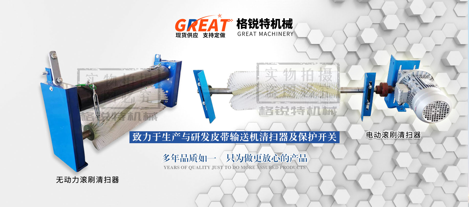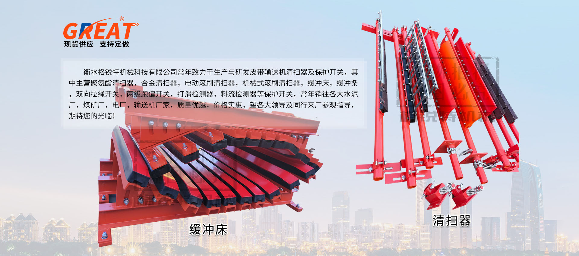 衡水格銳特機(jī)械科技有限公司常年致力于生產(chǎn)與研發(fā)皮帶輸送機(jī)清掃器及保護(hù)開關(guān),其中主營聚氨酯清掃器,合金清掃器,電動(dòng)滾刷清掃器,機(jī)械式滾刷清掃器,緩沖床,緩沖條,雙向拉繩開關(guān),兩級(jí)跑偏開關(guān),打滑檢測(cè)器,料流檢測(cè)器等保護(hù)開關(guān),常年銷往各大水泥廠,煤礦廠,電廠,輸送機(jī)廠家,質(zhì)量優(yōu)越,價(jià)格實(shí)惠,望各大領(lǐng)導(dǎo)及同行來廠參觀指導(dǎo),期待您的光臨!!!